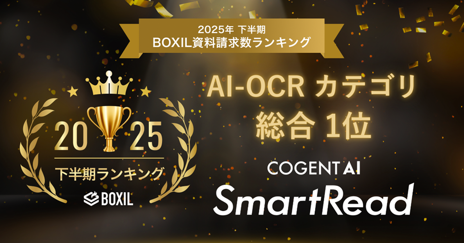 株式会社Cogent Labs(本社:東京都港区、代表取締役 兼 CEO:エリック・秀幸・ホワイトウェイ、以下コージェントラボ)が提供する次世代AI OCRサービス「SmartRead(スマートリード)」は、スマートキャンプ株式会社が主催する「2025年下半期 BOXIL資料請求数ランキング」のAI-OCRカテゴリにおいて総合1位を受賞しました。